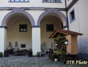 A főépület jó állapotban, a melléképületek már kissé düledeznek. A toronyban óra, ami akkoriban nagy ritkaságnak számított. Egykori istállók, várkapu, várfal, aztán át a hídon a parkba jutunk.