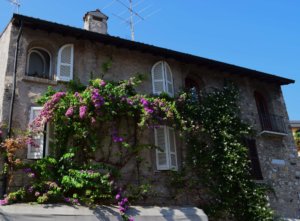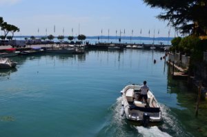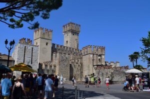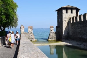 Veronából cirka háromnegyed óra alatt érünk Sirmionéba, a Garda-tó déli csücskébe. Az előbbi történelmi városnézés most egy kis mediterrán nyaraló-paradicsom hangulatba csap át. Nem kell sokat várni, a középkor újra szembejön. A mocit a parkolóban kell hagyni, a településre, illetve félszigetre a hídon át csakis gyalog léphetünk. Még páncélzat nélküli is pihegünk a harminc fokos melegben.