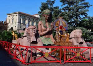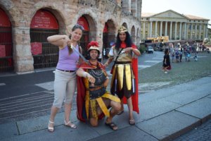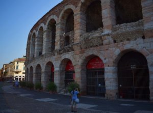 A városfal mellett parkolunk, így hamar eljutunk gyalogosan a csodás Amfiteátrumhoz. Hirtelen egyiptomi szfinxek között lépkedünk. Szomorúan vesszük tudomásul, sajnos az Aida operáról lemaradunk, két nap múlva lesz az előadás a 25 ezer főt befogadó Colosseumban. Ez Olaszország harmadik legnagyobb római kori arénája. Előtte két katonával pózolunk. A bejáratnál kígyózó sorok, ezt most kihagyjuk.