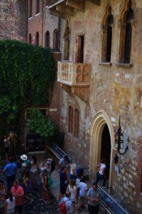 Irány Júlia háza, a via Giuseppe Mazzinin jutunk oda. Később látjuk Rómeóét is, de ott kevesebb nézelődő tolong. Jó a városmarketing, hiszen az eredeti történet – Mariotto és Gianozza szerelme – Sienában játszódik, de Shakespeare-nek köszönhetően ma egy veronai csodával több van.
